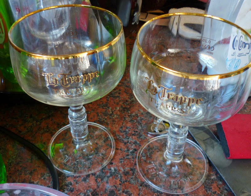 I loved them for their shape, basically they are giant Babycham glasses and Himself loved them because they said 'La Trappe' on the side (The Trap is a Northern term for the toilet.)